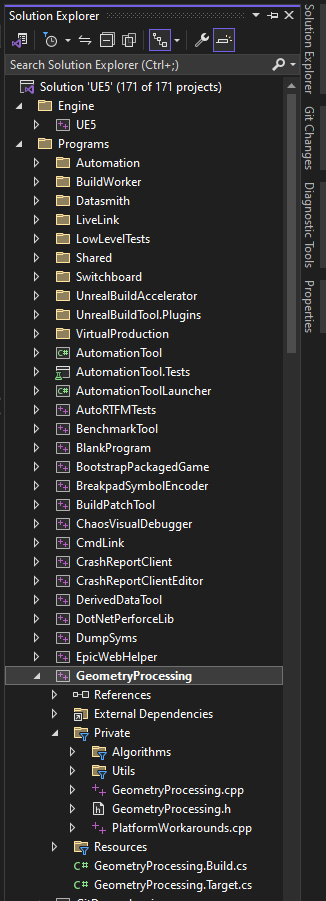 - Build the GeometryProcessing program. For Visual Studio, here is a screenshot showing where you can find it in the Solution Explorer